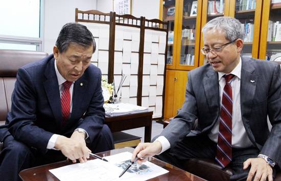 ▲이재홍 파주시장이 황진하 국회의원을 방문해 적극적인 협조를 요청하고 있다.(사진= 파주시)