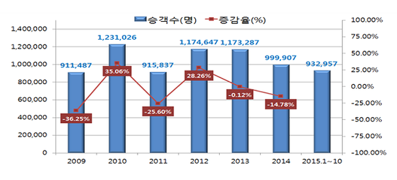 ▲부산항 국제여객터미널 이용객 통계(`09~`15.10월 현재). (표제공=BPA)