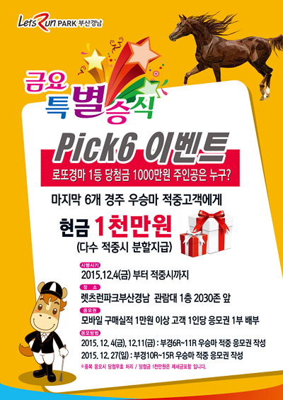 픽식스(Pick-6) 이벤트는 1000만원의 대박행운을 거머쥐는 주인공이 나올 때까지 계속적으로 렛츠런파크 부산경남에서 시행될 예정이다. 오는 금요일에는 과연 백만 분의 일의 확률을 뚫고 6개 연속경주를 모두 적중시키는 최종 우승자가 나타나 1000만원을 차지할 수 있을는지 관심이 모아지고 있다.