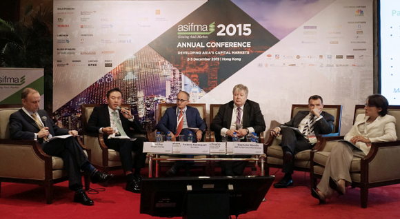 ▲'ASIFMA 2015'에 참석중인 유재훈 예탁결제원 사장(왼쪽 2번째)이 3일 '증권시장인프라 연계세션'에 패널로 참가해 발언하고 있다. (사진제공=예탁결제원)
