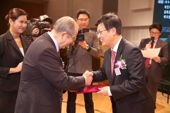 ▲최성 고양시장이 이수성 전 국무총리로부터 세종대왕 나눔봉사 대상을 받고 있다(사진= 고양시)