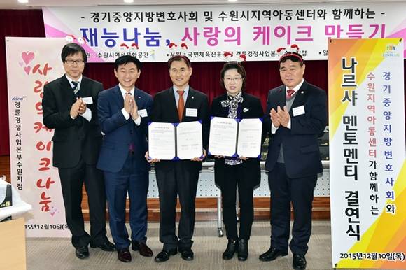 수원지역아동센터(센터장 이상남)과 경기중앙지방변호사회(회장 장성근)은 10일 수원시여성문화공간-휴에서 나르샤 멘토 멘티 결연을 맺었다.