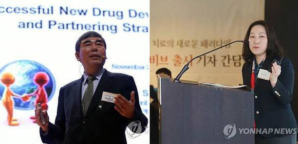 ▲신약 개발, 의료민영화 등 호재에 힘입어 내년에도 제약업계가 선전할 것으로 예상되는 가운데, 주요 제약사의 시가총액이 순자산가치를 앞질렀다는 점에서 주가 거품을 경고하는 목소리도 나온다. (왼쪽부터)지난달 열린 한미약품의 신약 수출 실적 설명회에서 한미약품 이관순 대표가 7조원이 넘는 신약 수출 실적을 올린 비결에 대해 강연하고 있다. 올해초 한국화이자제약의 듀아비브 발매 기자간담회. (사진=연합뉴스)