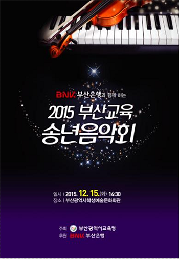 부산시교육청이 오는 15일 오후 2시 30분 부산학생예술문화회관에서 BNK금융그룹 부산은행과 함께하는 '2015 부산교육 송년음악회'를 개최한다.