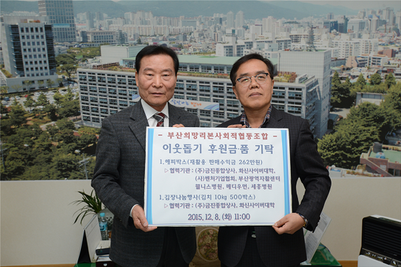 이번 기탁은 ▲㈜금진종합상사 ▲화신사이버대학 ▲(사)벤처기업협회 ▲부산시자활센터 ▲웰니스병원 ▲메디우먼 ▲세흥병원이 함께 참여한 재활용품 수거 박스(일명 '해피박스')로 모은 판매 수익금 등 각계각층의 후원자와 자원봉사자들이 함께했다.