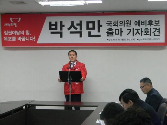 새누리당 박석만 국회의원 예비후보는 18일 오전 10시 목포시의회 시민의 방에서 기자회견을 통해 언론인과 목포시민 다수가 참석한 가운데 내년 4월 13 실시하는 제20대 국회의원 선거 목포지역구 출마를 공식 선언했다.