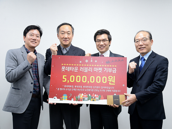 롯데백화점 부산본점(점장 전형식), 롯데호텔부산(총지배인 김성한), 롯데면세점 부산점(점장 정삼수)은 최근 롯데백화점 부산본점 지하 1층 광장에서 진행한 '러블리 마켓'을 통해 모아진 기부금 500만원을 부산진구노인복지관(관장 김익현)에 전달했다. (사진제공=롯데백화점)