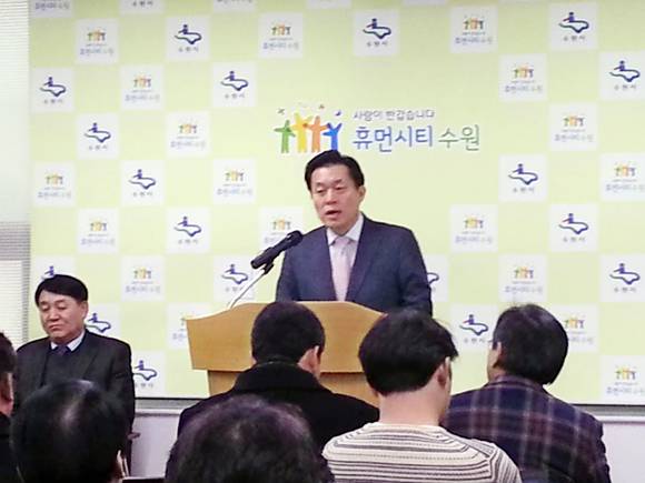 ▲29일 오전 수원시청 브리핑룸에서 이재준 수원시제2부시장이 퇴임 기자회견을 열며 사실상 총선 출마를 선언했다.