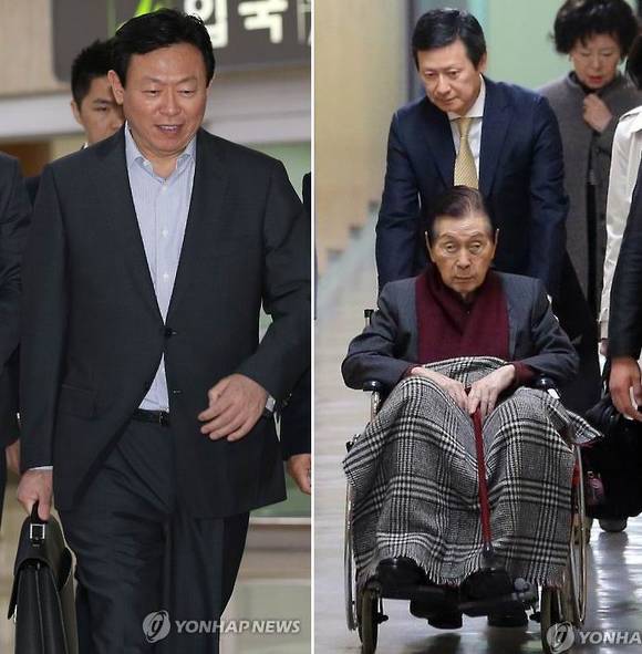 ▲신동빈 롯데그룹 회장(왼쪽 사진)과 휠체어에 탄 신격호 롯데그룹 총괄회장의 거동을 돕고 있는 신동주 SDJ코퍼레이션 회장. (사진=연합뉴스)