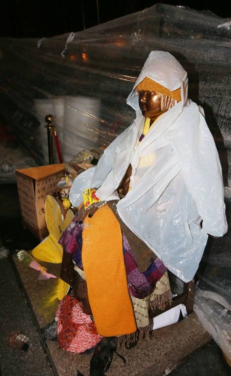 비가 내린 지난 30일 서울 종로구 옛 일본대사관 앞 소녀상에 우비가 씌워져 있다.