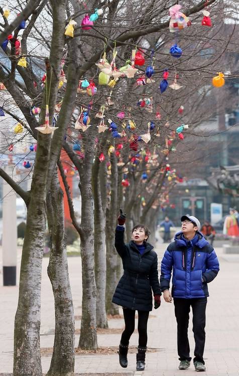 병신년(丙申年) 새해를 하루 앞둔 31일 인천시 중구 월미공원 가로수에 새해 복을 기원하는 복주머니와 복조리가 걸려 있다.