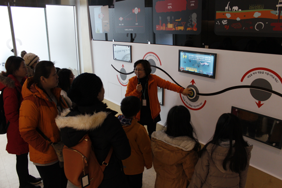 ▲지난 25일 관광객들이 부산기후변화체험교육관에서 기후환경에 대한 해설사의 설명을 듣고 있는 모습. (사진제공=부산관광공사)