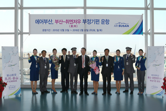 에어부산은 31일 오전 10시 30분 김해국제공항 국제선 청사에서 부정기편 취항식 행사를 가졌다. 해당 부정기 항공편은 에어버스 320-200(162석) 항공기로 주 2회(월·목) 운항할 예정이다. 취엔저우로 가는 BX3655편은 김해국제공항에서 월요일 오전 8시, 목요일 오전 11시 30분에 출발하며, 비행시간은 약 3시간이 소요된다.