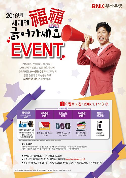 BNK금융그룹(회장 성세환) 부산은행과 경남은행이 2016년 신년 대고객 카드 사은행사인 '새해엔 福福 긁어가세요!' 이벤트를 3월말까지 진행한다.