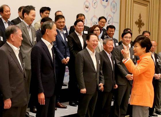 ▲박근혜 대통령이 지난해 7월 청와대에서 열린 재계 총수·CEO들과의 간담회를 마치고 대화하며 함께 웃고 있다. (맨 앞줄 왼쪽부터) 정몽구 현대자동차그룹 회장, 허창수 GS그룹 회장 박용만 두산그룹 회장, 구본무 LG그룹 회장, 이재용 삼성전자 부회장, 김승연 한화그룹 회장. (사진=연합뉴스)