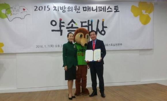 매니페스토 약속대상은 한국매니페스토실천본부가 지난 12월 21일 전국 시·군·구 의원을 대상으로 현재까지의 공약이행 현황과 주민소통 활동을 평가지표로 삼아 2015년 매니페스토 약속대상 수상자를 선정했다.