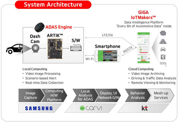 KT의 IoT 소프트웨어 플랫폼 ‘기가 IoT메이커스(GiGA IoTMakers)’와 삼성전자의 IoT 하드웨어&소프트웨어 플랫폼 ‘아틱(ARTIK™)’, 카비의 차선과 차량을 인식하고 추적하는 ADAS(Advanced Driver Assistance System, 안전운전지원 시스템) 기술이 결합됐다.