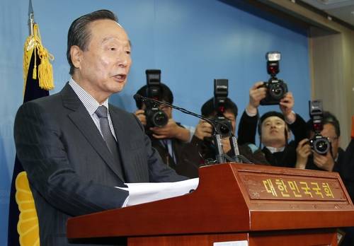 ▲'동교동계' 좌장인 더불어민주당 권노갑 상임고문이 12일 오전 국회 정론관에서 탈당 기자회견을 하고 있다.(사진=연합뉴스)