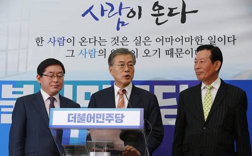 ▲더불어민주당 문재인 대표가 14일 국회에서 열린 인재영입 기자회견에서 박희승(왼쪽) 전 수원지법 안양지원장과 하정열 한국안보통일연구원장에게 입당원서를 받은 뒤 환영의 말을 하고 있다. (사진=연합뉴스)