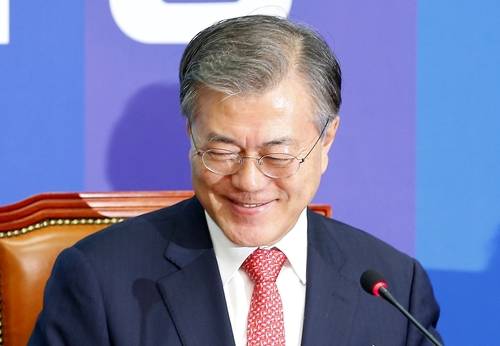 ▲더불어민주당 문재인 대표가 15일 오전 국회에서 열린 최고위원회의에서 김종인 전 의원의 선거대책위원장 영입을 비롯한 더민주의 인재 영입과 관련한 기사를 보고 활짝 웃고 있다.(사진=연합뉴스)