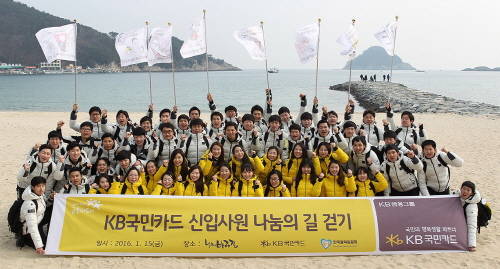 KB국민카드는 신입사원 54명이 지난 15일 새벽 5시부터 오후 5시까지 경상남도 남해바래길을 걸으며 이동거리 등에 비례해 기부금을 조성하는 ‘나눔의 길’ 행사를 진행했다고 17일 밝혔다.