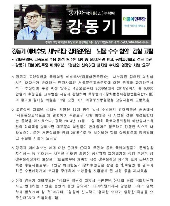 더불어민주당 고양 덕양을 강동기 예비후보가 지난 13일 같은 지역 김태원 국회의원(새누리당)을 뇌물 수수 혐의로 고발하자, 김태원 의원은 15일 "새로운 것도 없고 사실관계도 맞지않아 정치신인의 치기로 보고 대응을 자세해왔으나 더이상 인내할 수 없다"며 강 예비후보를 명예훼손으로 맞고소하고 해명 보도자료를 배포했다.