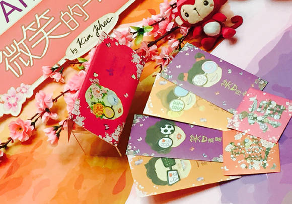 ▲김지희 작가의 '실드 스마일' 시리즈 이미지를 사용한 기념품. 중국 설날에 사용하는 홍빠오 세트가 제작됐다.