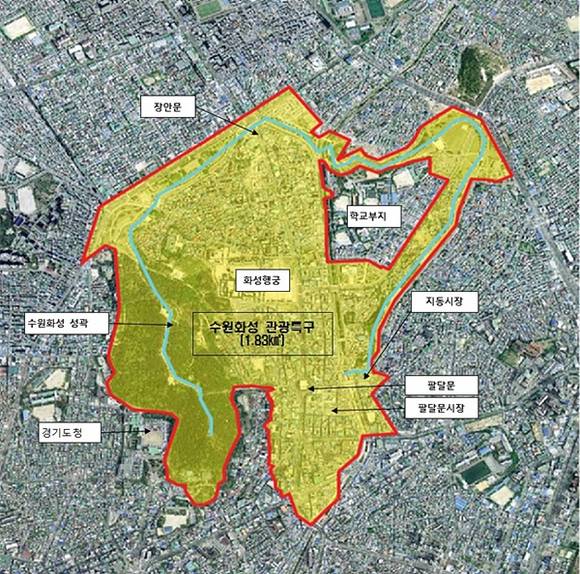 수원화성 관광특구는 화성 성곽을 중심으로 팔달산~장안공원, 장안문 연무대~팔달문 시장 일대 1.83㎢로, 수원화성 내 일부 비관광 지역을 제외한 성내 대부분의 지역을 포함하고 있다.