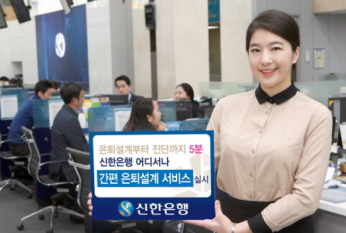 신한은행은 19일 전국 영업점에서 고객이 정한 은퇴 후 예상 생활비에 따른 몇 가지 설문을 통해 은퇴준비현황과 준비자금마련 솔루션을 제공하는 ‘간편 은퇴설계서비스’를 제공한다고 밝혔다.