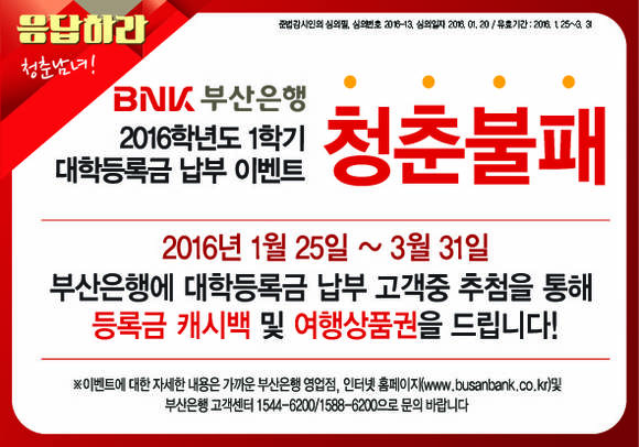 BNK금융그룹(회장 성세환) 부산은행이 오늘 3월 말까지 대학등록금 납부 이벤트인 '청춘불패-응답하라 청춘남녀' 사은행사를 진행한다.