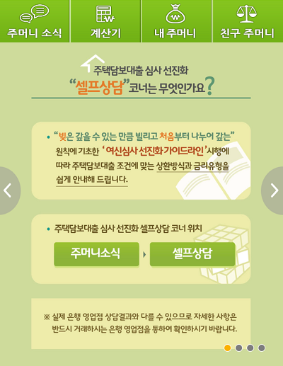 공사는 '안심住머니' 앱에 대화식 셀프상담을 신설해 향후 주택담보대출을 받고자 하는 고객이 앱의 질문에 순서대로 대답하면 이번 가이드라인 적용대상인지 여부를 알려줌으로써 선진화 방안에 대한 고객 불편과 혼란을 최소화하도록 했다.