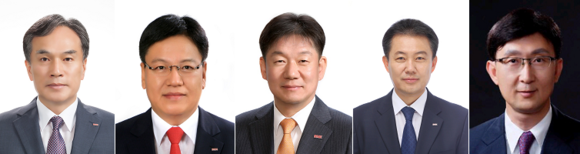 ▲왼쪽부터 BNK시스템 이영우 대표, BNK신용정보 성명환 대표, BNK저축은행 김승모 대표, BNK캐피탈 김일수 대표, BNK투자증권 안효준 대표 내정자. (사진제공=BNK금융지주)