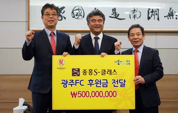 광주시는 1일 오후 4시 광주시청 3층 접견실에서 윤장현 광주광역시장(광주FC 구단주), 정원주 중흥건설 사장, 기영옥 단장 등이 참석한 가운데 5억원 후원금 전달식을 가졌다.