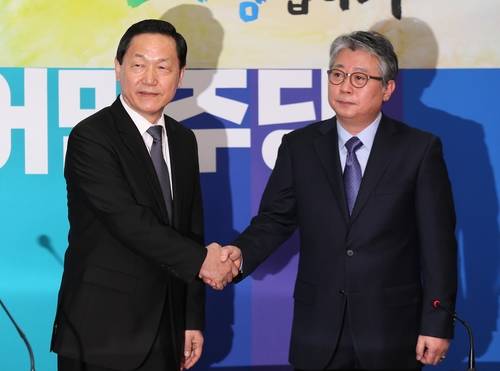 ▲조응천 전 청와대 공직기강비서관이 2일 여의도 국회 본청에서 김상곤 더불어민주당 인재영입위원장과 악수를 하고 있다. 조 전 비서관은 이날 더불어민주당에 입당하며 "정치가 희망"이라고 정계진출의 계기를 밝혔다. (사진=연합뉴스)