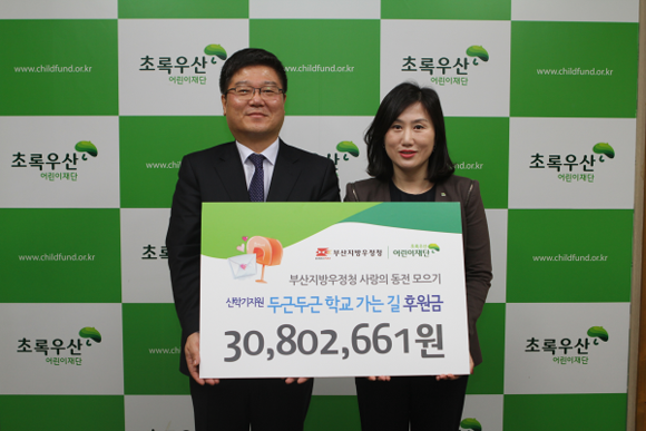 ▲왼쪽부터 정한근 부산우정청장, 이수경 초록우산 어린이재단 부산본부장. (사진제공=부산우정청)