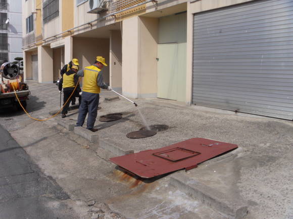 ▲목포시 보건소가 지카바이러스 예방 활동으로 대형건물 정화조에 집중방역소독을 실시하고 있는 모습.