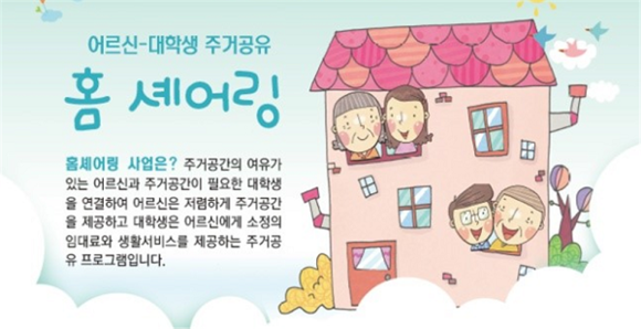 '홈셰어링 사업'은 세대융합형 주거공유 프로그램으로 주거공간의 여유가 있는 어르신과 주거공간이 필요한 대학생을 연결하는 공유 프로그램이다.