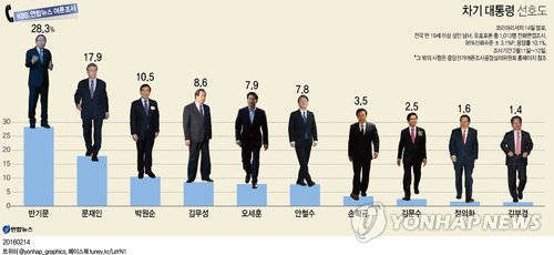 ▲차기 대통령 후보 지지율에서 반기문 유엔 사무총장이 2위 문재인 더불어민주당 전 대표를 10% 포인트 이상 차이로 따돌리고 1위를 달리는 것으로 있는 것으로 나타나 정치권의 관심을 끌고 있다.(도표=연합뉴스)