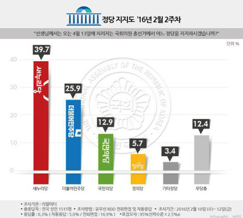 여론조사 전문기관인 리얼미터가 2016년 2월 10일부터 12일까지 3일간 전국 19세 이상 유권자 1,515명을 대상으로 정당지지도를 조사한 결과 새누리당이 지난주 주간집계 대비 0.5%p 하락한 39.7%로 3주 만에 다시 30%대로 하락했고, 더불어민주당 역시 1.1%p 하락한 25.9%로 20%대 중반으로 내려앉았다.