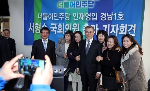 ▲더불어민주당 문재인 전 대표가 11일 경남 양산시청 프레스센터에서 열린 서형수 전 한겨레신문 사장의 4·13 총선 양산시 출마 선언 기자회견에서 지지자들과 함께 기념촬영을 하고 있다. (양산=연합뉴스)
