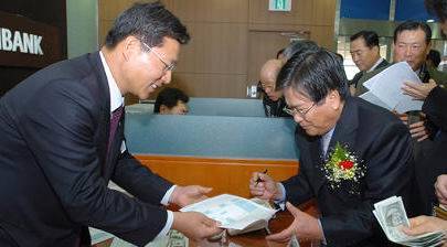 ▲우리은행 개성지점이 문을 연 2004년 12월, 입주기업 대표들이 환전을 하며 밝게 웃고 있다. 이들의 희망과 기대는 남부기 극한 상황으로 치달으면서 물거품이 될 위기에 놓였다. (사진=연합뉴스)