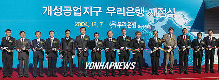 ▲2004년 12월 7일 남북한 주요 인사들이 참석한 가운데 북한 개성공업지구에서 열린 개성지점의 개점식 장면. 이후 11년 2개월 만에 남과 북은 최악의 대치상황을 맞고 있다. (사진=연합뉴스)