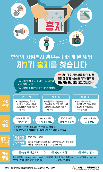 부산시자원봉사센터(센터장 이규환)는 부산지역의 자원봉사활동을 알리는 데 앞장설 부산시자원봉사센터 홍보자원봉사단(홍자) 7기를 모집한다고 15일 밝혔다.