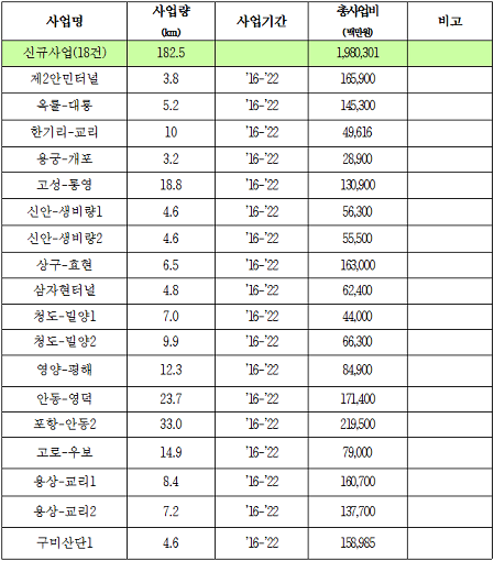 ▲2016년 영남권 신규 국도사업 현황. (표제공=부산국토청)