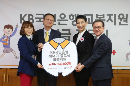 KB국민은행은 지난 18일 노사가 함께 모은 재원으로 저소득가정의 중·고등학교 진학 청소년을 위한 ‘KB 희망키움 교복지원’ 후원금을 대한적십자사에 전달했다고 19일 밝혔다.