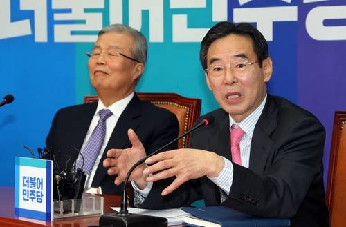 ▲더불어민주당 공천관리위원회(위원장 홍창선)는 현역의원 평가 하위 20%를 공천에서 원천배제 하기로 한 가운데 컷오프 되는 현역이 최대 16명에 이를 것으로 보이는 컷오프 대상자에게 23일 경 개별통보한 뒤 25일 명단을 공개하기로 한 것으로 알려져 정치권의 관심이 집중되고 있다. 더불어민주당 홍창선 공천관리위원장이 기자들의 질문에 답하고 있다. 왼쪽은 김종인 비대위 대표.(사진=연합뉴스)