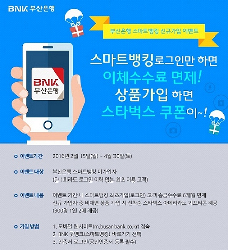 이벤트 대상은 부산은행 스마트뱅킹을 이용한 적이 없는 최초 신규가입 고객 전원으로, 부산은행 스마트뱅킹에 공인인증서 등록 후 로그인 하면 6개월간 횟수 제한 없이 송금수수료가 면제된다.