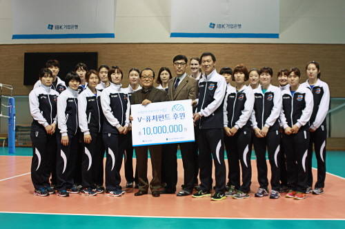 ▲23일 경기 용인시 기업은행 기흥연수원 체육관에서 이정철 알토스배구단 감독(첫번째 줄 왼쪽 일곱 번째), 신만근 대한배구협회 전무이사(첫번째 줄 왼쪽 여섯 번째), 유석철 대한배구협회 부회장(첫번째 줄 왼쪽 다섯 번째), 남지연 알토스배구단 주장(첫번째 줄 왼쪽 네 번째) 등이 후원금을 전달하고 기념촬영하고 있는 모습. (사진제공=기업은행)