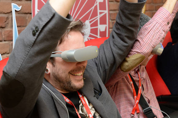 LG전자가 스페인 바르셀로나에서 열린 ‘MWC 2016’에서 모바일 VR 기기 ‘360 VR’을 체험할 수 있는 공간을 마련했다. 관람객들이 ‘360 VR’로 실제 롤러코스터를 타는 듯한 가상현실을 체험하고 있다.