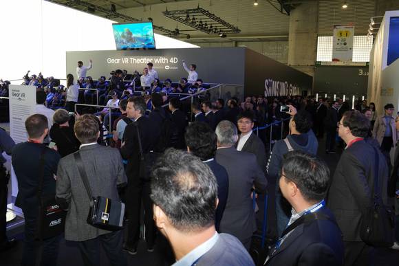 ▲‘기어 VR’로 가상현실 체험을 하기 위해 기다리는 관람객들. (사진제공=삼성전자)